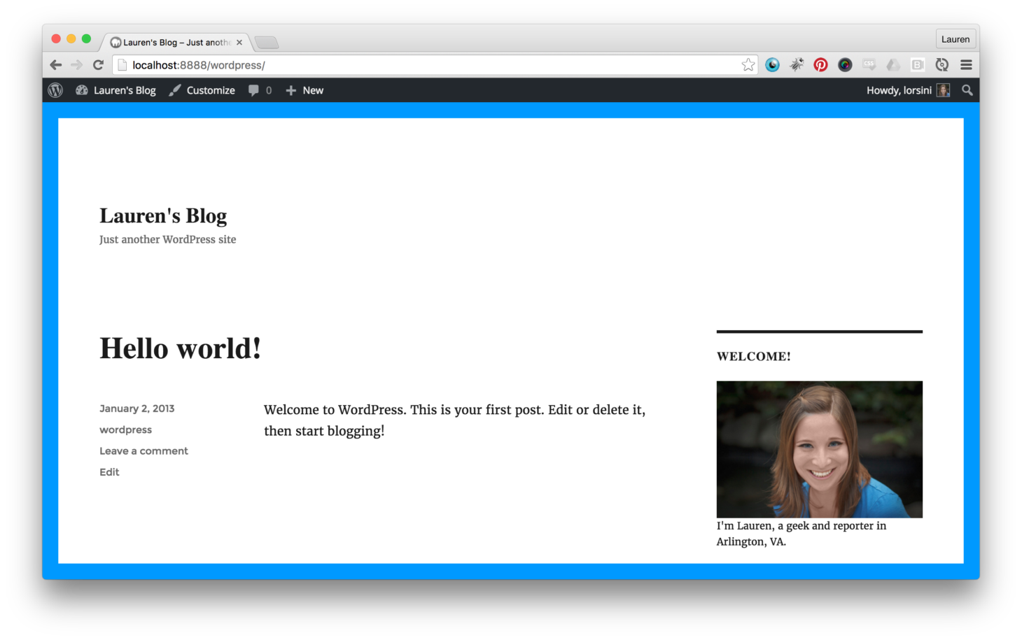 Melde mich anAktivieren Sie Ihr Theme, und wenn alles gut gelaufen ist, sollten Sie Ihre fertigen Änderungen live sehen können. Ta da! Ich habe die neue Randfarbe und die Kopfzeilenschriften, die ich wollte. Noch besser, selbst wenn WordPress das Twenty Sixteen-Theme aktualisiert, werden meine Änderungen nicht weichen.