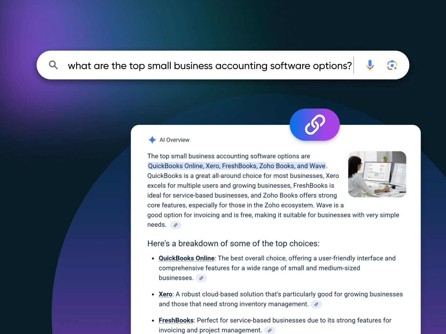 Les mentions de marque se produisent lorsque votre entreprise, produit ou service est nommé dans un résultat de recherche sur une plateforme IA (comme ChatGPT) ou dans la Vue d’ensemble IA de Google. Généralement, celles-ci n’incluent pas de lien direct vers votre site web.